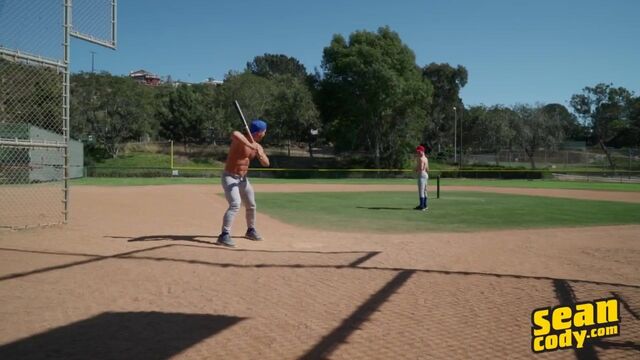 Cuties Deacon and Riley take off their shirts and lace up their cleats for a trip to the baseball field. Deacon chokes up on the bat, teasing, "Want me to hit it hard or am I gonna be hitting one soft?" Riley shoots back "I'll make it easy for you. Promise," before tossing a beautiful pitch. When these guys get back home, though, it's Deacon who's pitching as Riley sucks his big cock and hops on top for a ride. These muscular studs try out a super athletic planking piledriver before Deacon cums all over Riley's cock, then licks it off!