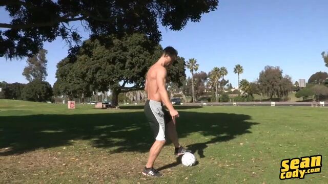 &I'm from Poland,& Gustav explained as he kicked a soccer ball around. &I've been here almost ten years.&Why did you move over here?& I asked.I wanted to try something different,& he replied. &Have a new adventure.Gustav's English is good, but his accent was a little hard to understand at times!You're pretty good with the soccer ball,& I said.Yes, I've been playing since I was a little dude.Europeans and their soccer!The most striking thing about Gustav is his crystal blue eyes! He's also got a smooth, muscled body and nice-sized uncut cock!