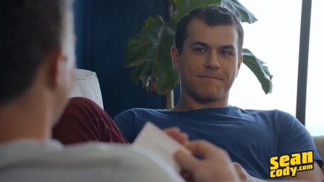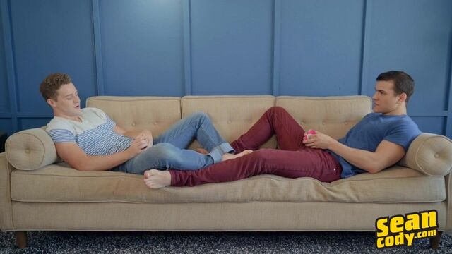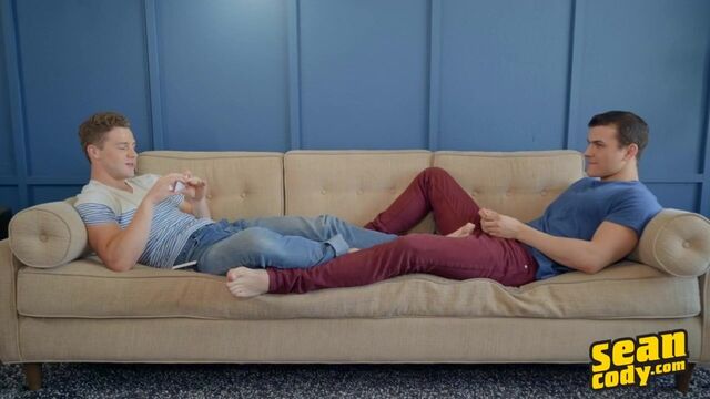Ayden has heard stories of Robbie's huge cock, and Robbie's been told about Ayden's bottoming abilities, so these two cuties get to know each other better with a little Q&A on the couch. Turns out these guys share a fantasy of joining the Mile High Club. "We should go on a trip sometime!" Ayden proposes. They also both enjoy getting frisky out and about. "I get off really really quick in public usually," admits Robbie. Ayden can't wait to feel Robbie's nine-inch dick in his big ass, and the sexy top can't believe just how well the handsome bottom takes it till they're both cumming all over each other!