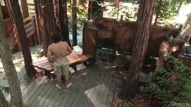 Muscle stud Woody Fox hits the outdoor showers at the campgrounds. Hidden beneath enormous redwoods, the area offers up some instant excitement when Woody spies Seth Santoro naked under the water. Slowly stripping down, Woody casts subtle glances towards Seth, and Seth looks over his shoulder to return eye contact. As Woody turns on the water in the next shower stall, he turns around to show off his swelling cock. Working the soap into a thick lather, Seth scrubs his muscular butt, then invites Woody to help wash his back. As Woody walks up from behind, his massive boner thrusts into Seth's ass cheeks. With the water running over their bulging muscles, Seth and Woody turn to each other and kiss passionately. Sinking to his knees, Seth inhales Woody's enormous uncut cock. The oral service works Woody up to the point where he's eager to get a taste of Seth's tight hole. Spreading Seth's meaty ass, Woody dives in tongue first for an epic rim job that has Seth eager for more. Moving to a nearby bench, Woody alternates between rimming Seth's ass and sucking his thick cock. Legs in the air, Seth eagerly awaits Woody's massive tool inside of him, and Woody delivers. With powerful thrusting, Woody dominates Seth's tight hole. Turning around and bracing himself against the shower wall, Seth takes Woody's cock doggy style. When Woody sits down on the bench, Seth lowers himself down on Woody's meat and uses his powerful legs to ride it up and down. Woody starts to thrust up from beneath Seth, which makes Seth's hard cock shoot a massive load! Kneeling down, Seth opens his mouth and catches Woody's load in his mouth.