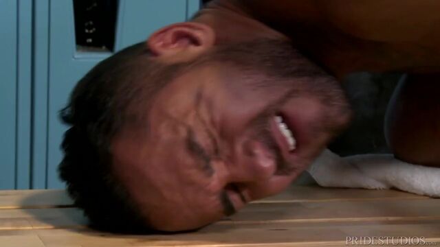 Bruno is a boxer and has just come to the locker room after a sparring match. He is tense and frustrated when Hunter walks in trying to pump him up. Hunter praises him, but Bruno is not in a good mood. Hunter starts massaging his shoulders and then Bruno exclaims that what he needs is a good fuck! He pulls out Hunter's cock and starts sucking him. Hunter then rims Bruno's nice ass while he wears his jock strap. Bent over, Hunter fucks Bruno over the bench at first and then up against the lockers as Bruno begs to be pounded. Bruno then grabs the punching bag and throws it to the floor where he lies on his back and Hunter continues to fuck him. Hunter fucks him so good, that Bruno shoots all over himself and Hunter follows. Enjoy!