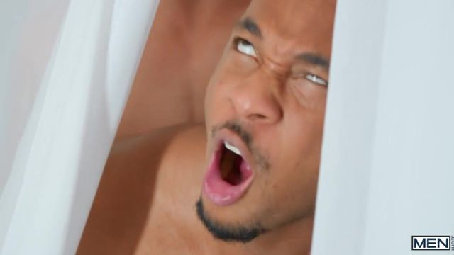 Trent King and his girlfriend are surprised to arrive home and walk in on his roommate, Malik Delgaty, jacking his big cock on the couch! His GF is disgusted, but Trent is intrigued, so after she's in bed, he sneaks out to get a second look. Malik feeds Trent his cock and then fucks the bottom doggystyle behind the curtains... until Trent's girl wakes up and catches them! After she storms out, Trent wants more of that good dick in his hole, so he rides Malik on the bed, then gets fucked missionary till he cums and takes a hot facial.