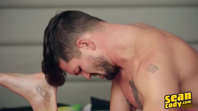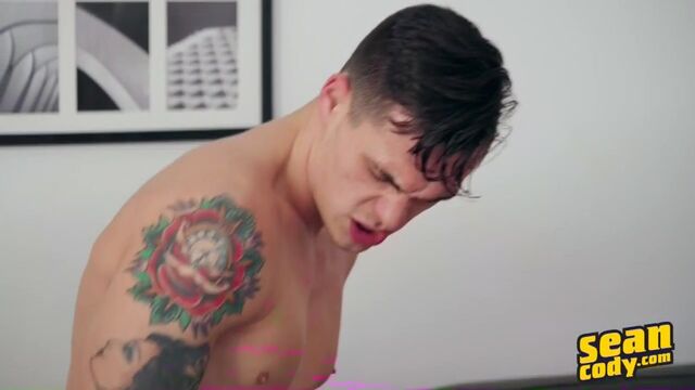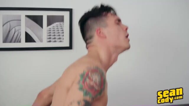 Stud Brysen doesn't take his time about undressing tattooed bad boy Dave and sucking his cock while fingering Dave's hole, and Dave wants Brysen's cock inside him. The power bottom demands that Brysen fuck him harder as he gets pounded in missionary and doggystyle, and even after ultra deep pile driver, Dave's hungry ass craves even more. "You filled me up. The hole wants more," Dave taunts, with Brysen's cum still on his face. "I'm sure we can arrange that," the top replies with a grin.