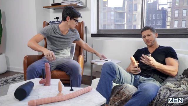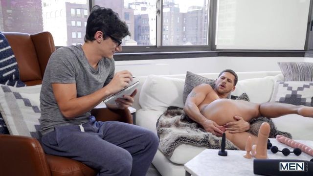 When his roommate Aiden Ward is late with the dildo review video he promised his sponsors, Roman Todd generously offers to help out with some toy testing. Roman sees a big, thick dildo and can't resist sucking it, so Aiden takes notes as Roman uses the large toy on himself and describes the sensations. But all those dildos make Roman want the real thing, so he starts sucking Aiden's cock! Aiden plays with Roman's hole and warms it up with a butt plug, then fucks him doggystyle. He licks the bottom's ass and fucks him spoon. Aiden turns the tattooed hottie on his back and pounds him in missionary till Roman cums, then gives him a facial!