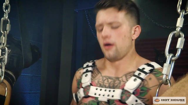 Crackling leather stretches against the muscled bodies of Sebastian Kross and Griffin Barrows. Naked but for his Rough Trade black three-point harness, Griffin sinks to his knees and swallows every inch of Sebastian's huge cock. Griffin's deep throating fetish takes center stage as strings of saliva drip to the floor as Sebastian facefucks Griffin's wet, eager mouth. Griffin reclines on a fuck bench and leans his head back, opening his mouth to receive Sebastian's member. Grabbing Griffin's harness, Sebastian rams his lengthy dick all the way down Griffin's throat, his balls slapping against Griffin's face with each vigorous pump. After nearly 10 minutes of taking Sebastian's thick and long cock down his throat, Griffin's so turned on that he turns around and offers up his butt. Sebastian parts Griffin's ass cheeks and dives in tongue first. He spits on Griffin's hole, then uses his tongue to drive his saliva down Griffin's fuck chute. Spit drips from Griffin's hole down his smooth nut sack as Sebastian plays with the sensitive head of Griffin's swollen, throbbing cock. With Griffin's hole lubed and ready to get fucked, Sebastian lays down flat on the bench. Griffin lowers himself down and uses his beefy legs to ride Sebastian's rod. As Sebastian picks up speed, his huge, low-hanging nuts swing back and forth through the air with wet slaps. Griffin's hole stretches wide as Sebastian's cock drives deeper inside. Sweat drips from both their bodies as they move to a sling. Ramming his meat into Griffin, Sebastian produces primal moans from the insatiable bottom. As Sebastian pummels Griffin's prostate, Griffin reaches an incredible climax, blasting his torso with giant gobs of cum. Sebastian shoots his load on Griffin's ass, then scoops it up and feeds it to him, capping it off with passionate kissing.