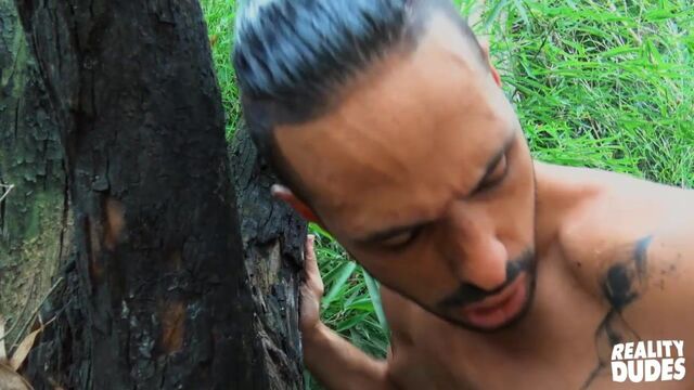 - Description: When this couple gets horny on their nature hike, they find a convenient spot behind a shed where they can get their cocks out unobserved. After some al fresco ass-eating, the short-haired hunk fucks his guy's mouth and his hole up against the tree. The studs flip fuck, as the once-top takes his turn getting pounded. The guys jack their cocks as they make out, then the long-haired hottie fucks the cum out of his man before filling his mouth with jizz.