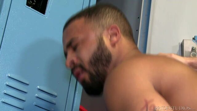 Brendan & Damian are in the locker room and Damian is excited to show Brendan that he is wearing his jock strap. Brendan is totally enamored with seeing Damian's perfect ass framed in the straps of the jock and he cannot keep his hands off his ass. Brendan then drops to his knees and begins rimming Damian's ass deep and wet. Damian then sucks Brendan's cock through his jock strap for a while before begging for Brendan to fuck him. They fuck while keeping their jock straps on and Damian loves every thrust of Brendan's hard cock up his ass. Brendan then pulls out and sucks Damian's hard cock for a while and then lays him on his back and begins to ride his cock deep and hard. Damian then flips him over and fucks him on his back until Brendan shoots his built up load and then Damian blasts his load all over Brendan's beard and face. Enjoy!