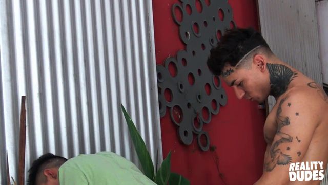 - Description: Even bad boys like to kick back with a cool glass of lemonade sometimes, and since the courtyard is deserted, this tatted-up hunk decides to fully enjoy himself by rubbing his dick. When the maintenance guy shows up, he puts his mop aside to give that cock a polish instead. After a delectable al fresco blowjob, the tattooed top fucks the bottom doggystyle in the open air before covering the janitor's face with spunk.