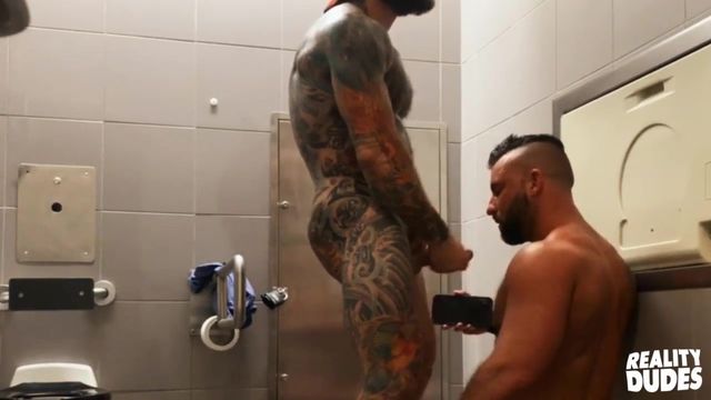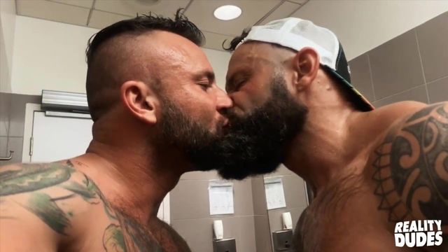 Jetsetting, bearded babes, Tank Joey and Pupcheer, have some time before their flight leaves and they're already ready for takeoff. They sneak into an airport washroom together and strip down, showing off their muscular tattooed forms for their camera phones as Tank sucks Pup's big dick. Pup lubes up Tank's ass and fucks him doggystyle, then jacks off both their cocks. These burly studs absolutely drench the room in lube, but they don't have time to stay and clean up--it's time to fly!