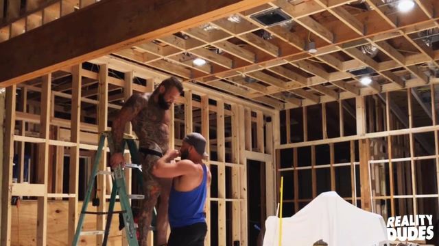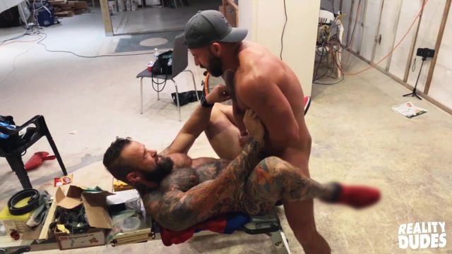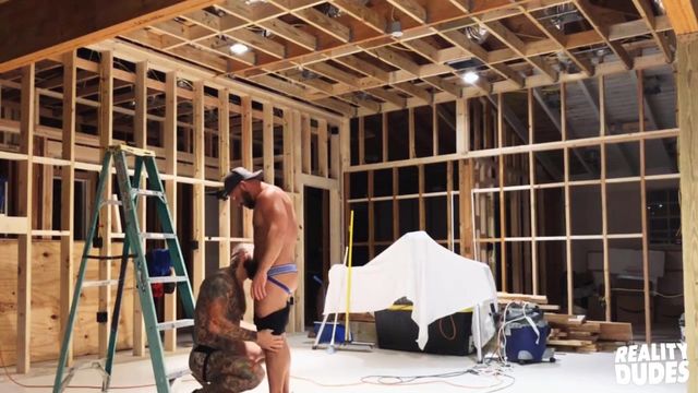 Tank Joey is doing some construction when Pupcheer comes to see what he's up to. His muscular lover being up on the ladder puts him in just the right position for Pup to eat Tank's ass and suck his cock. Tank bends over the workbench so Pup can finger his ass and fuck him bareback doggystyle. The guys get a little messy as Pup cums all over Tank's ass and the floor, then he sucks Tank's cock till he shoots a huge load all over Pup's face.