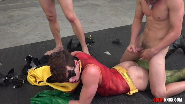 - Description: Welcome superhero fans! In this new Colby Knox new gay porn parody, we join Robin, our hero in distress, being broken down by one of the diabolical thugs from the infamous Gotham City crime community. This superhero’s resolve is strong, but when something goes wrong neither he nor the thugs are unable to control where their instinctual bodily urges take them. The lines of hero and villain begin to blur as a primal urge takes over. Superhero Robin, played masterfully by Christian Bay, finds himself captured and tied up in the basement of some of Gotham’s most notorious thugs. The two thugs, played by Colby Chambers and Mickey Knox, have this beautiful superhero bound and in full interrogation mode trying to break him down. It doesn’t take long before they begin to expose him to the full dark side of Gotham and they take turns using the boy wonders hot warm mouth for a sweet exchange of cock sucking fun. Unable to move, Robin takes two full mouth pounding cocks from the thugs before thug pup gets his opportunity to hump away at the superhero’s mouth. The boy wonder doesn't make it out of his bonds before Colby Chambers gets a nice big mouthful of that sweet superhero cock. The thug’s pup is so eager to get inside of Christian Bay’s tight plump ass he doesn't even wait to get him untied. Robin is in for a night full of ass domination and gets moved to the floor where the thugs can have their way with his powerful ass. Who knew a superhero’s belt and cape could be so useful for getting extra leverage to grind deeper into their ass? The two take turns smashing that sexy superhero ass again and again as Robin takes what’s being given to him. Colby is first to bust his giant load of warm cum all over Robin’s tight ass. Thug Pup Mickey, follows his master’s lead and gets one last ride on the superhero ass before shooting his load. Like a good pup, he takes his time to clean up the sticky mess by licking up both loads. After the two thugs have collapsed from exhaustion, Robin strokes out his own huge load of cum. Enjoy this Halloween Gay Porn Parody by Colby Knox featuring body art by Taylor Reign.