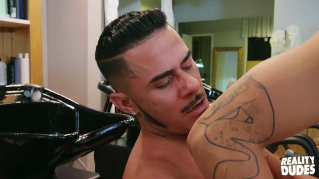 Hot Latin barber Cesar Xes is just about ready to close up for the day when he gets a last-minute walk-in looking for a "wash and sperm." As the hot hairdresser lathers up Max Blairwood's locks, the horny client checks out his stylist's bulge up close and personal. The customer's always right, so after a quick towel dry, Cesar gets his cock out for Max to suck. Max gets on his knees so Cesar can slide that thick barber pole into his ass, then rides him in the chair before taking Cesar's big load on his face. Time to rinse and repeat!
