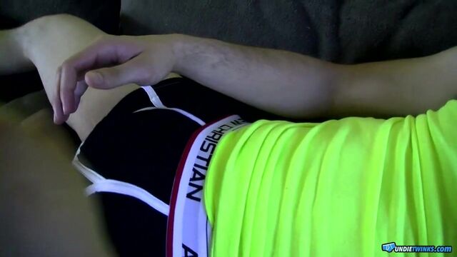 Hot uncut jock Jimmy Roman shoots a huge load in his tight Andrew Christians!