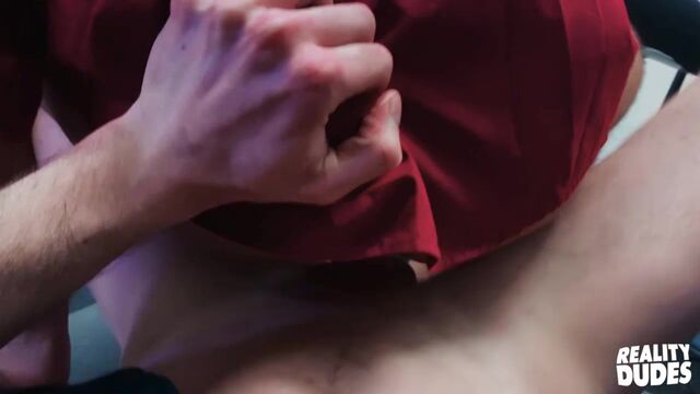 Fit cutie Collin can't keep his eyes off the scruffy, tattooed receptionist Eric. Even though they're both in a busy waiting room, Collin can't resist taking out his phone and recording himself sneakily stroking his cock while Eric struggles not to stare. The tall, curly-haired stud calls Collin behind the desk to service his thick dick with his tongue and hole while everyone else in the office is none the wiser.
