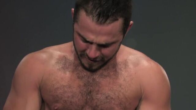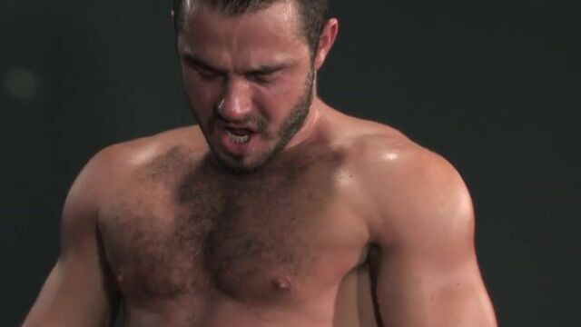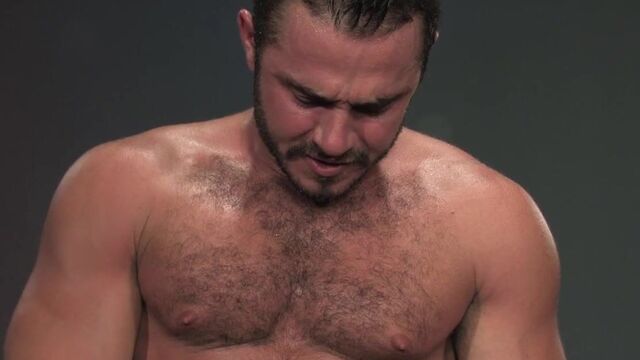 In one corner is Marcus Ruhl: olive skin, bulging muscle, thighs built to wrap around a guy. In the opposite corner, Jessy Ares: full beard, fat cock, manscaping-be-damned. There's no bell, but imagine the director calling 'Action,' and they meet in the center and kiss instead of shaking hands. Both guys are naked, and wielding hard ons. The sheer mass of flesh demands a different kind of foreplay: some punching, some pushing and shoving to determine the pecking order...or the fucking order. Jessy jumps on a table and wraps both hands around Marcus's neck, immobilizing it for a rapid face-fuck. Don't fail to feast your eyes on Marcus's amazing buns as he endures the assault on his larynx and ups the ante by lifting Jessy off the ground and sucking his balls too. That's worth a kiss and a chance to drill Jessy's face. Marcus then puts his haunches in Jessy's face, for a tongue-basting and drilling that leave Marcus gasping at both ends. It's Marcus' ass end that gets Jessy's cock, heavy and hard and ready to do its worst on Marcus's dripping hole. The dripping is contagious, and soon both men's cocks are dripping with the aftermath of the explosions of four balls achieving simultaneous release.