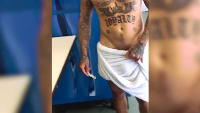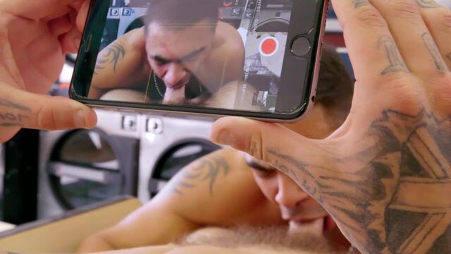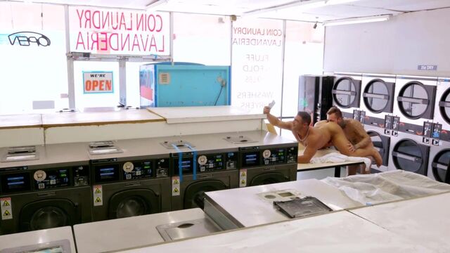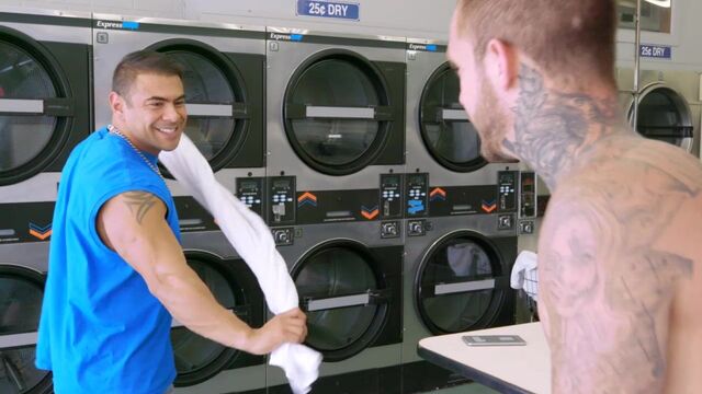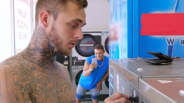 Naughty, tattooed babe Brian ran into the laundromat to get rid of the evidence that he’s been cheating on his girl after another girl got sick all over him. He throws all his clothes into the washing machine, and grabs a towel from a nearby dryer to cove