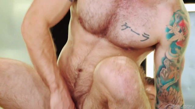 Sexy JJ Knight's jockstrap can't even contain all of the meat he's packing. Lowering himself down to his knees, hot Aussie Skippy Baxter begins swallowing JJ's monster cock. Deep throating such a massive rod is daunting, but Skippy knows what he's doing, and his cock sucking skills have JJ eager for more. Skippy lays on his back with his legs in the air, parting his ass cheeks and inviting JJ to play. JJ uses his tongue to get Skippy's hole lubed with spit, then slides in a finger to explore. A second finger follows, stretching Skippy's hole and preparing him for the pounding to come. After teasing Skippy's ass with the tip of his dick, JJ plunges his super cock deep inside. Power bottom Skippy keeps one hand on his hard cock and the other hand holding his leg up, giving JJ deep access. Switching things up, JJ leans back and Skippy sits down on his cock. Using his beefy, hairy legs, Skippy raises and lowers himself on JJ's huge fuck stick. This expert bottom knows what he's doing! After getting his cock milked by Skippy's ass, JJ's ready to bust a nut: he stands over Skippy's face and blasts his load right down Skippy's open mouth. Skippy releases his spunk and sprays it across his hairy torso, and the two studs seal the deal with primal kissing.