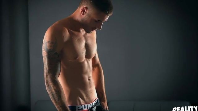 Brown-haired Tony is ready to flex his biceps and show you his muscular, tattooed body. The seemingly shy hunk takes his time rubbing and stroking his big dick before pulling down his underwear and revealing his erect, cut cock.