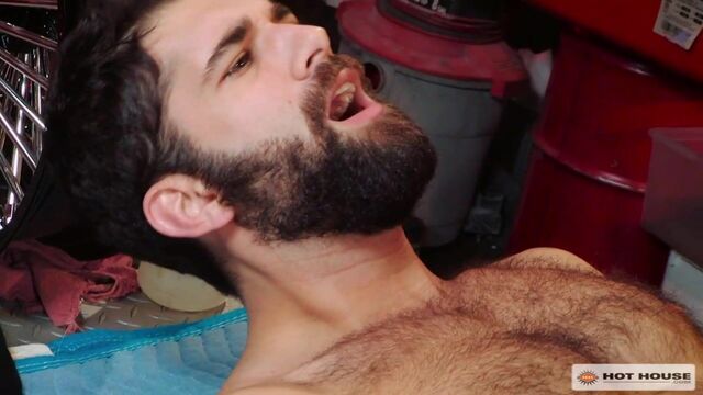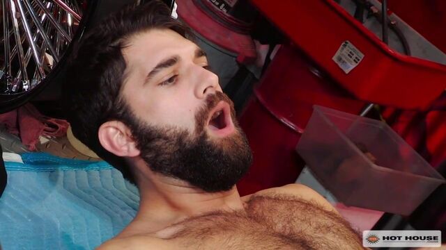Beefy Austin Wolf is working at the chop shop when bearded stud Tegan Zayne walks in to inquire about an estimate to get his motorcycle fixed. Tegan's short on cash, so he strikes a deal with Austin who mischievously suggests that they can 'work something out.' It's not long before Tegan realizes it's going to cost him his ass, and that's fine by him. Clothes begin to peel away, and Tegan starts to lick his way from Austin's pits down to his cock. Then, Tegan gladly chokes on Austin's fat hog, until it's time for Austin to digs into Tegan's hairy bubble ass with his tongue. Once Tegan's hole is dripping in spit, Austin glides his fat hot-rod into Tegan's back door. Pounding Tegan doggie-style then missionary with total abandon, Tegan asks Austin, 'Is this ass good enough for my bike repairs?' Eager to be drenched in Austin's cum, Tegan offers up his body as Austin strokes, landing his load onto Tegan's abs. Finishing him off, Austin fingers Tegan's hole until his cock explodes with jizz, sending spurts of cum through the air.