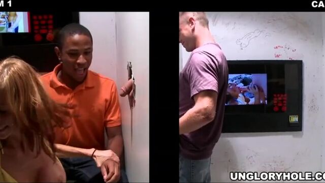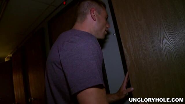 Jayden is just cruising the aisles for some porn when we come up to him with a proposition. Who would actually turn down a blow job from a hot chick? Well it took some convincing to get this guy in the back room, but after seeing her tits and face, he was convinced and ready to get sucked off. After sliding his dick through the hole, his dick goes into the mouth of a man. Unluckily for Jayden, he stuck his dick in the wrong hole. Enjoy.