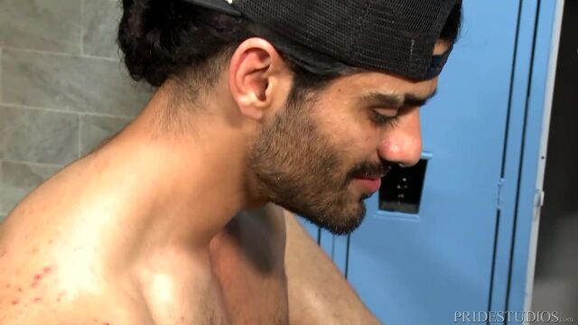 Ali and Micah are in the locker room and Micah is very horny to be fucked. Ali is a little reluctant to have sex because he does not want to get caught, but Micah convinces him. Soon both of their clothes are coming off and they both are kissing fiercely licking each other in every spot they can. Micah gets down on his knees and begins sucking Ali's hard cock gagging and spitting all over it. Ali then sucks Micah long and deep. Micah then bends Ali over and rims his ass for a while before having Ali rim his ass. They both take turns licking and sucking on each other's eager hole until Ali is ready to fuck Micah. Ali starts to fuck Micah and the utter passion between the two is unmistakable. They can't keep their hands off one another let alone stop kissing. Ali continues to fuck Micah's tight ass in several positions which puts him over the edge and Micah shoots a nice load of cum on himself. He then begs Ali to feed him his cum which he gladly releases his built up load all over Micah's eager face and mouth.Enjoy!
