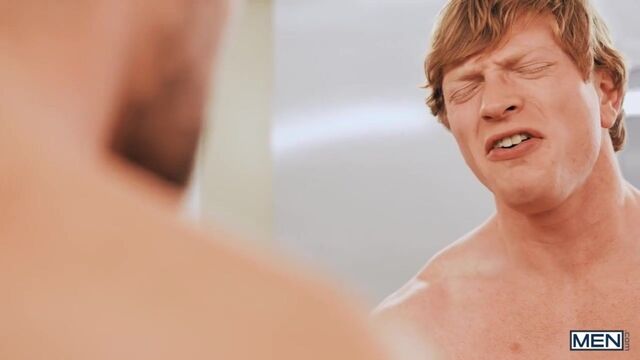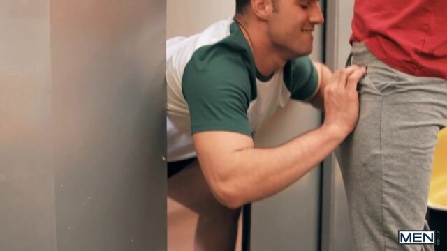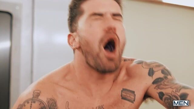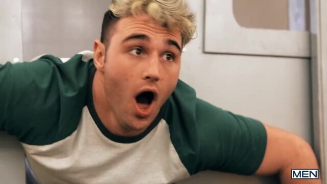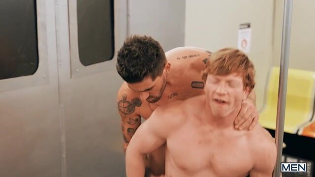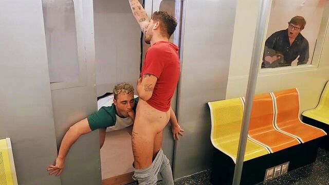 Chris Damned has the subway car all to himself so he starts rubbing his cock through his gray sweats, at least until Michael Boston gets on. Chris closes his eyes and leans his head back, pretending he's just resting, but Michael notices his bulge and snaps a pic before he reaches his stop. He turns to flirt with Chris... and gets stuck in the doors! Chris rushes over to help, but Michael gets dick-stracted and pulls down the tattooed hunk's pants to get a mouthful of that cock. Subway mechanic Kyle Connors is called in to fix the stuck doors, but when he's greeted by Michael's muscle ass, he gets his cock stuck deep inside the bottom instead! Kyle fixes the doors and gets on the train so Michael can suck both dicks. Chris fucks Michael doggystyle, then sucks Michael's cock as the bottom rides Kyle on the seats. Pretty soon both tops are taking turns pounding Michael piledriver next to the pole before they both jizz on his face before Michael jacks off till he cums.