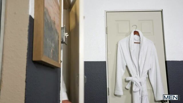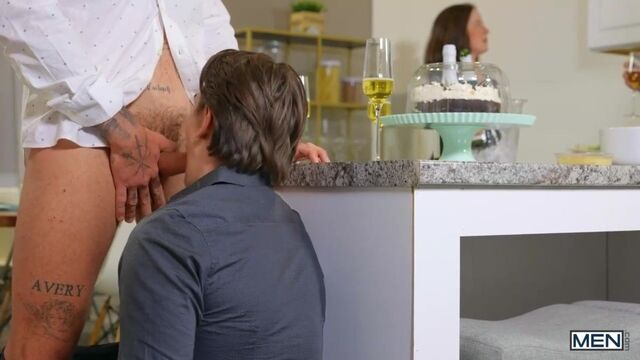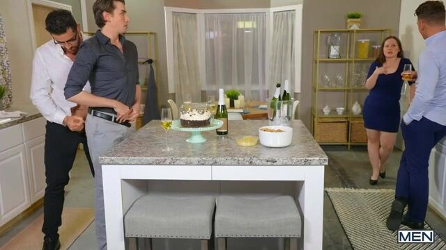Chris Damned and his wife are throwing a birthday bash for his buddy Jack Hunter, but Chris would rather give the birthday boy a present of cock. He sneaks away to the bathroom to try to take care of his hard-on, but his wife drags him back to the party. As she's distracted chatting with JJ Knight, Chris flirts with Jack, squeezing the bottom's lush ass, then bends him over the counter and fucks him! Jack gets down behind the island to suck Chris's cock, and the guys sneak off to the bedroom where Chris penetrates Jack on the bed. JJ follows the sound of their moaning and sneaks in as Chris is fucking Jack piledriver, getting it on video! Jack rides Chris till he cums, and the guys try to sneak back to the party, but JJ stops Chris and shows him the evidence. They head to the bathroom, where Chris sucks JJ's big dick... till Jack comes looking for them and they invite him to join them! JJ fucks Jack doggystyle as he sucks Chris's cock, then both tops cum all over the bottom's face and in his mouth.