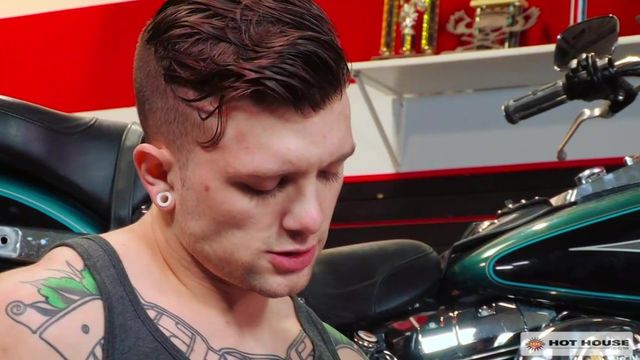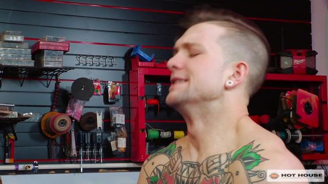 Handsome stud Sebastian Kross is in the shop cleaning up parts, while Brendan Phillips cleans his motorcycle. Sebastian asks 'do you think we have time for a break?' to which Brendan smiles and offers Sebastian a back rub. Sebastian accepts and the rubdown quickly turns into Brendan down on his knees gulping on Sebastian's girthy cock. Sebastian returns the favor with a tongue drilling rim job with Brendan bent over a workbench. Sebastian digs into his toolbox and finds a rubber bolt to work into Brendan's eager ass. The energy shifts into high gear when Brendan lies on his back and takes a drilling from every inch of Sebastian's hefty cock. They switch to an intense sit fuck where Sebastian pounds up into Brendan's ass. Brendan unmounts and lays back again and jerks his load out on his abs with a mouthful of Sebastian's tool. Sebastian strokes his meat stick until he unloads in Brendan's mouth.