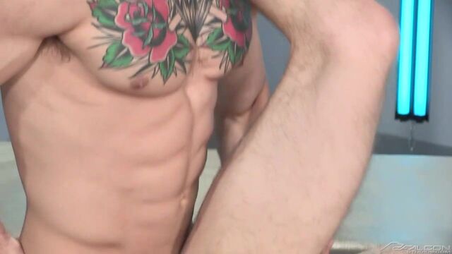 Stunning and ripped Sebastian Kross and sexy Tryp Bates face each other and clench their cocks together as they stroke. Tryp hits his knees and sucks Sebastian's huge cock down to the base. They transition to a 69, with Tryp sitting on Sebastian's face and swallowing Sebastian's cock from above. Tryp's hole heats up and Sebastian's cock is rock hard, so they amp things up. Removing his ass from Sebastian's face and landing it on his throbbing cock, Tryp gives them both what they want. Sebastian pounds up into Tryp's insatiable hole before putting Tryp on his back and relentlessly drilling his prostate. They both jerk their meat until Sebastian shoots his load on Tryp's hairy chest as he oozes his warm cum onto his abs.