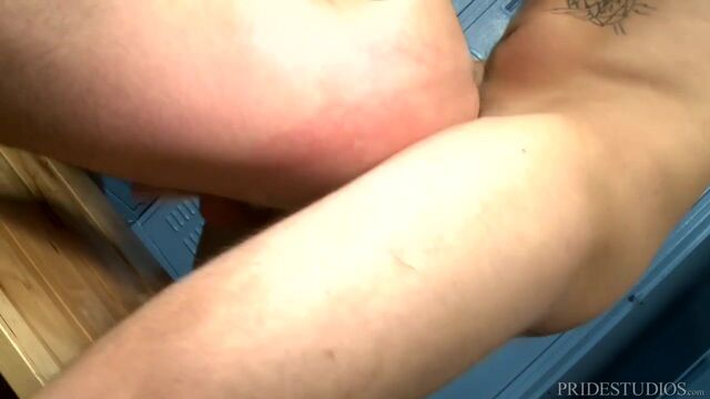 Dustin and Tyler have entered the locker room and Dustin is explaining this article that he recently read that says if you have risky sex or public sex it increases the pleasure of your ejaculation. Tyler says he just likes sex, so anyway is fine with him. Dustin tells him that they should have sex right there in the locker room to prove the article and Tyler agrees. They start out kissing and stroking each other and soon both cocks are out hard as a rock. Tyler sucks Dustin first then Dustin sucks Tyler's big thick cock. Dustin rims and fingers Tyler's sweet ass before pushing him up against the lockers and fucking him deep. He bends Tyler over the bench fucking him even deeper and then flips him on his back and fucks the cum out of him. Dustin can't hold back any longer and pulls his dick out and shoots his load onto Tyler's face and beard.Enjoy!