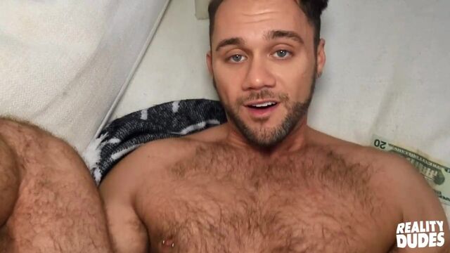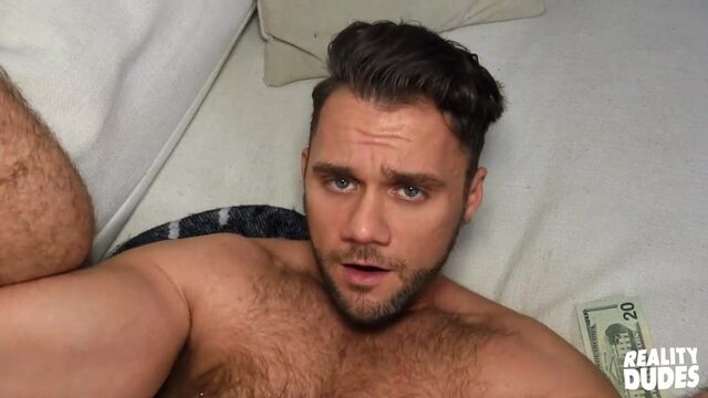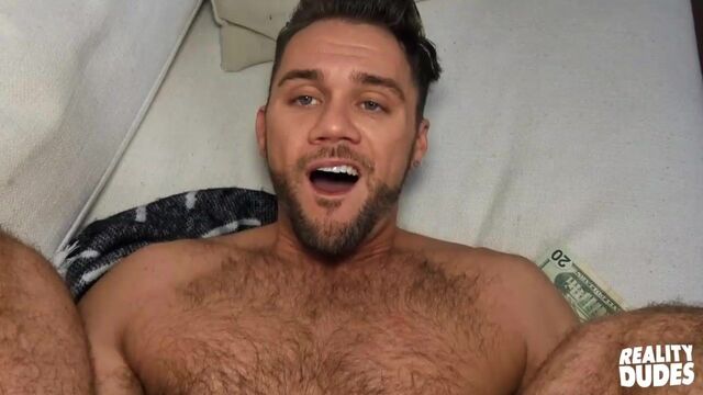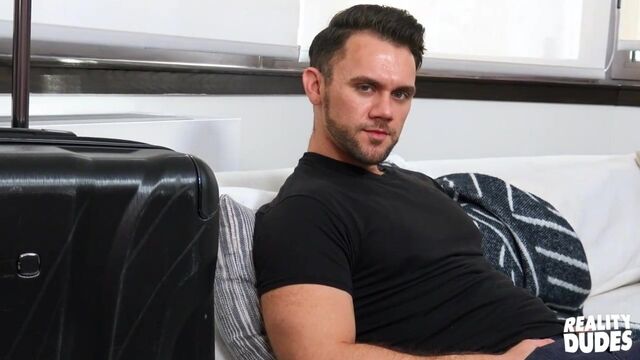 When I heard the buddy of a good friend of mine needed a place to crash on a layover, I was happy to let Blaze Austin use my spare room, but I wanted to be sure he knew what he was in for. I sat Blake down to explain that I like to be naked at home, and he was chill with it. I took off all my clothes, and soon convinced him to do the same! Blake noticed how hard I was, and I decided to see if he would join me. It just took a bit of encouragement for him to start playing with his dick. After all his travels, Blake needed some cash so it was easy to entice him to suck my dick for a few bills, and for two hundred more I was bending him over and fucking his ass! He lay on his back and opened his legs for me to fuck his hole mish, then hungrily sucked me till I gave him a facial. His load was so big, he'll definitely be back for his next layover.