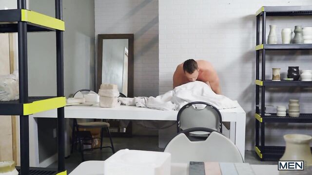 Pierce Paris is a pompous sculptor with a big ego but an even bigger cock. When Pierce's assistant, the tall and fit Brandon Evans, discovers that Pierce has ordered a fake ass to be the template for his next sculpture he immediately intuits that Pierce is going to be using it for a lot more than just reference. Brandon waits until he catches Pierce fucking the toy then sneakily swaps his own ass in for Pierce's rubbery muse. When Pierce discovers the deception, he can't deny that Brandon's ass is just as good (if not significantly better) than the toy and gives the horny intern the pounding that he deserves in this sneaky sexy flip-fuck scene.