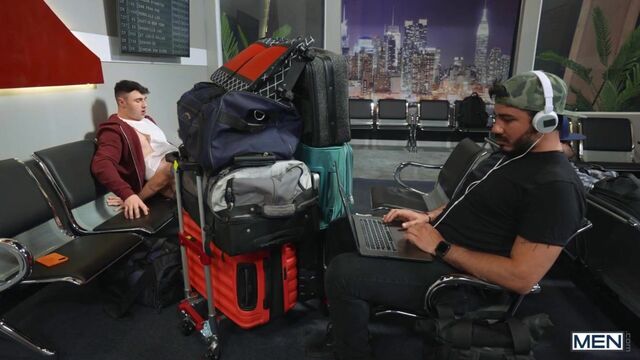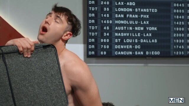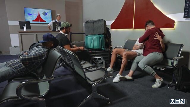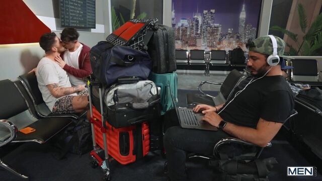 Waiting in the airport is boring, so when couple Chris Damned and Michael Boston get horny, Chris sneakily gets to his knees to suck Michael's dick, observed by the cute gate agent! The employee stands up for a better view when the couple's hijinks get blocked by some luggage, but Michael hides behind the suitcases as his man rims him. The guys get spotted as Michael rides Chris reverse, and when the luggage owner moves away, the gate agent enjoys the show, taking out his cock and jacking it as he watches Chris fuck Michael doggystyle on the floor. It feels so good as Michael rides Chris and grinds on that dick, he begs his man to pound him harder in mish, and soon both guys are cumming!
