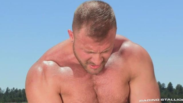 Massive Austin Wolf gropes deep into sexy Jacob Peterson's jeans, then thrusts his fingers into Jacob's mouth. Each wraps his arms around the other and they kiss deeply, pressing stubbled cheeks together. A pond and mountain meadow provide the backdrop. Jacob's mouth gravitates to the nipples on Austin's mighty chest, then drops to his cock. Austin's stuffs his cock down Jacob's throat as far as it can possibly go. Turning 180 degrees, Jacob offers up his ass. Austin wastes no time exploring its hot recesses with his tongue and fingers. He commands 'show it to me' as he prepares to drive his cock into Jacob's hole. Jacob rocks his hips as Austin thrusts. Austin grabs his neck, twists his head for a kiss then pushes him forward and fucks him in rapid-fire lunges. Austin increases the penetration by adding two fingers. He hooks a huge bicep under Jacob's thigh and hoists him into the air. He lies down for Austin to pour his load into his mouth, then suck it out again.