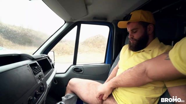 Jerome is behind the wheel and Jerry is handing off the packages, but it's each other's packages that these delivery guys are interested in. They take a little break to let off some steam, and dominant Jerome squeezes Jerry's balls before stroking and sucking his cock. The bearded bottom goes down on his driver and the guys hop out of the van to continue the blowjob in the open air, then hop in the back where Jerome spreads Jerry's ass and fucks him doggystyle. Jerome fucks the bottom till he cums, then gives him a special delivery of jizz.