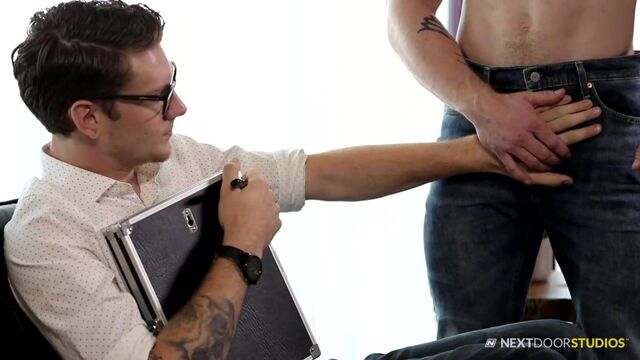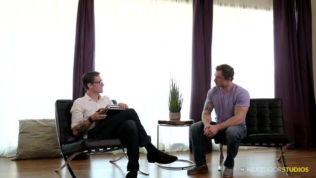 Markie More is conflicted. Unsure about his feelings towards his attraction to men, he's sought out some professional help for his situation. Therapist Blake Barnes has seen other patients with Markie's problem, but none so pronounced and full of obvious denial. Blake recommends Markie should act on more of his impulses and urges, and as he jots down a few notes, he realizes how effective his advice is received, as Markie reaches out and runs his hand up Blake's thigh. Happily married, Blake is flattered, but assures Markie that isn't what he meant. Markie persists, taking off his shirt, and he can instantly see that he's not the only one in the room who is repressing urges. He asks Blake to take his own advice, slowly unzipping his pants and pulling out his cock. Blake takes it into his mouth, cautiously at first, but with increasing desire as Markie's cock swells hard inside his mouth. Confident and enabled, Markie takes the lead, pulling Blake's shirt off and returning the favor, sucking off his therapist right in the middle of his office, before letting Blake have his way with his wanting and waiting ass. Markie mounts Blake, riding him reverse as he strokes himself hard, his cock bouncing against his stomach with Blake's every thrust. Really getting into it, Blake suggests Markie bend over his chair, and Markie does so, as Blake pounds him from behind, his cock sliding in and out of Markie's hole as he watches Markie moan in delight.Markie flips over and Blake fucks him til he cums, pulling out and nutting all over Markie's stomach, as they both smile at the break-throughs they've shared with each other.Enjoy!