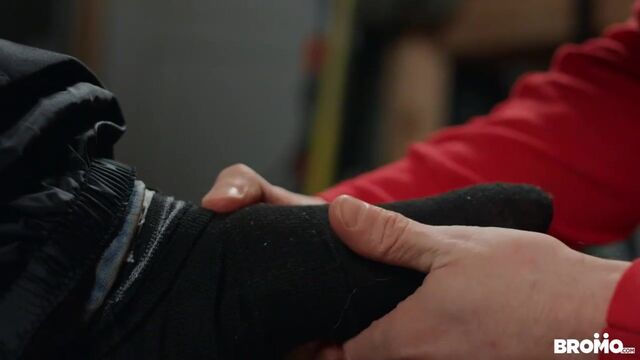 Ryan Bones and Thyle Knoxx are fully suited up for a ride through the winter cold on a snowmobile. Ryan puts the machine through its paces as Thyle hangs onto his waist, then the guys head back to the garage. That power between his legs has got Thyle hot and heavy despite the cold weather, and he strips off his snowsuit and longjohns, then removes Ryan's boot and kisses, licks, and sucks his foot. Ryan feeds Thyle his big cock, then bends him over the machine and fucks him doggystyle. Thyle rides that dick like he rode the snowmobile, then takes a deep pounding in mish till he cums, and Ryan finishes with a facial.