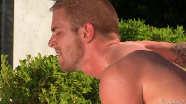 A dip in the pool may be cooling for some, but it lights a fire in the loins of Chris Bines and Scott Riley. They jump out, towel off and get naked in a hurry. Chris is hungry for the taste of Scott's succulent hole, so he helps himself by kneading Scott's bubble-butt and corkscrewing his tongue into his smooth crack. Scott assists by spreading his legs and his cheeks for Chris' tongue to go deeper. Scott says thank you with a sopping wet blowjob as Chris tweaks his own nipples. Bracing himself against a pool chair, Scott prepares for a hole-stretching hard fuck. Spit provides the lube for Chris' cock to slide in deep. Hitting the deck, they continue to fuck, missionary style. Sunlight reflecting off their sweaty abs highlights every ridge and muscle. After filling Scott's ass with dick, Chris fills his mouth with hot cum. Scott licks it all up, then shoots his bursting load onto Chris' abs.
