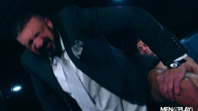 Dato Foland works for Marco Napoli as a security guard at Marco's club. After a busy night, Dato is wrapping up when Marco tells him through the earpiece to meet him downstairs. Marco is waiting for him behind the bar and hands him a check. Dato notices that his pay is short but Marco tells him that he's not short, he is being fired. Clearly upset, Dato tells his boss to fuck off and throws the check at him and begins to leave. Marco asks him to wait and asks Dato if he would be up to do anything to keep his job. Dato needs the money and agrees on doing whatever it takes to stay employed. In the end, Dato understood that the sexual favor was meant to keep his job but that doesn't mean he didn't enjoy it as much as Marco did. He's convinced his boss to keep him employed and to keep the check. Russian suited stud Dato Foland fucks Italian suited stud