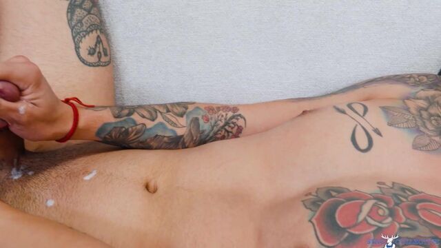 Kian Kane loves tattoos, is a total foot guy, and has great balls. He strokes his cock and plays with his ass for our camera before busting a big load.