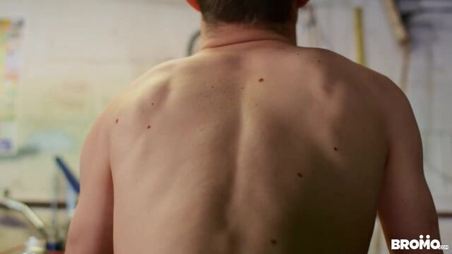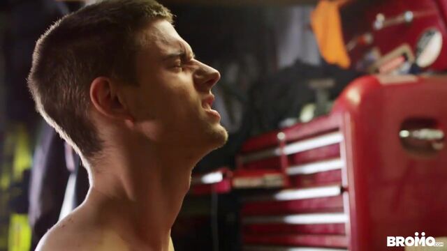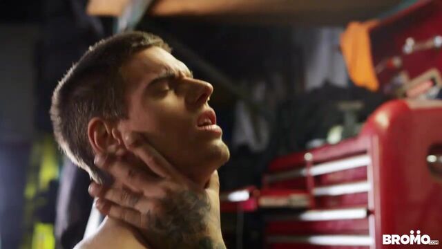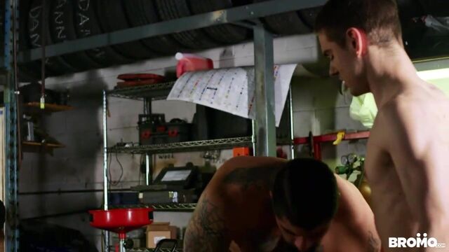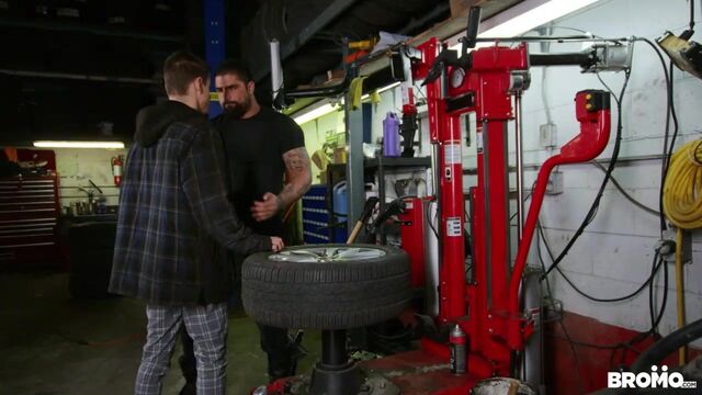 It's Lev Ivankov's first day working at the garage, and his boss, Ryan Bones, quickly realizes Lev has no idea what he's doing. Ryan shows him how things work around here, starting with putting Lev on the tire changer and feeding him his cock. Effortless rotation at the touch of a button is perfect for switching between pounding Lev's mouth and his ass before Ryan really shows Lev who's in charge by fucking him in standing doggystyle. Lev rides Ryan's dick till his boss puts him in the creeper seat and cums all over him!