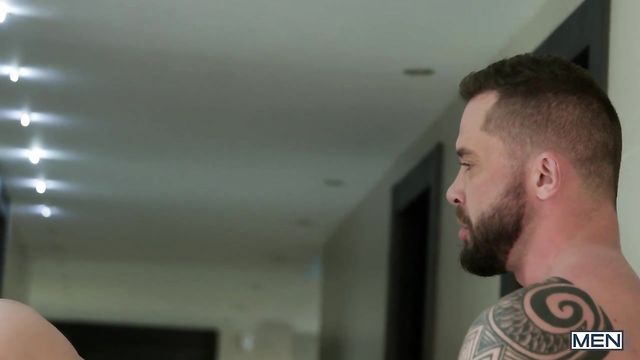 When Tyler Berg spots the beautiful Andy Onassis showering, water running down his masculine chest to his thick cock, he can't resist the sight. Andy drops to his knees to blow the bearded stud, swallowing it all the way down to the base. They move to the hallway where Andy bends over and lets Tyler worship his ass, passionately tonguing his hole before he fucks him up against the wall. Andy gets his turn fucking Tyler in the stairs, Tyler's hard cock bouncing as he eagerly rides the muscle daddy in this randy flip fuck tour de force.