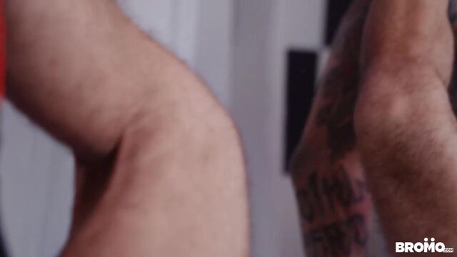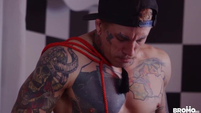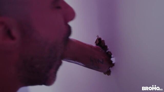 Bo Sinn calls up a number he finds advertising a glory hole service. When he gets there his hands are tied, his mouth taped shut and his cock shoved through a gloryhole to the eager mouth of Manuel Skye on the other side. Bo lets Manuel give him a deep and sloppy blowjob, but soon he wants more. The tattooed power top breaks free from his ropes, breaks down the wall and takes control of Manuel. Bo shoves his long cock down Manuel's throat with his signature mercilessness, making the sexy bearded stud gag on his massive cock. Bo takes the cords that were around his wrists and wraps them around Manuel's neck and cock while he plows into the toned stud's eager ass. Manuel loves every second getting dominated by Bo, his eyes rolling into the back of his head as Bo fucks the cum out of him over the bathroom sink.