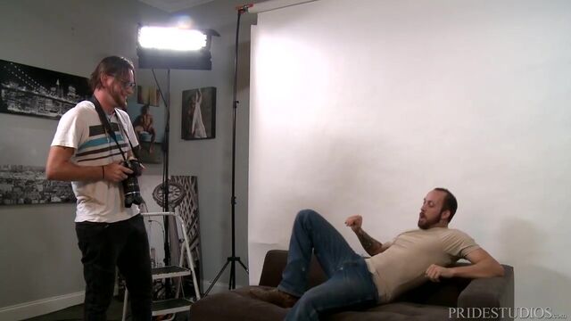 Jace Chambers is calling his assistant Anthony Jones into the photo studio. He tells Anthony to get things cleaned up and upload the photos from his camera. Anthony reminds Jace that he is doing a test shoot of his own and asks one more time for permission to use the studio and Jace's equipment. Jace heads out of the studio and Anthony begins cleaning and getting the studio ready for his shoot. Dustin arrives just as Anthony has finished setting up the studio. Anthony is nervous as he is a new photographer, but Dustin is immediately comfortable in front of the camera and he tells Anthony that he is getting turned on. Soon they are both kissing and revealing their huge cocks. Dustin at a little over 8 inches and Anthony who is about 9 inches and very thick. They exchange blow jobs and then Anthony fucks Dustin first at his request. Dustin then fucks Anthony and the scene ends with Anthony riding Dustin's cock until he explodes a creamy nut on Dustin's chest. Dustin then stands up and shoots his load on Anthony's eager face.Enjoy!
