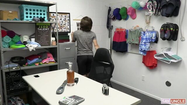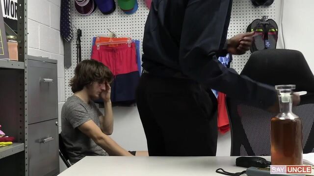 Security guard Devin Trez suspects young perp Troy Harlow of trying to steal, so he brings him to the backroom for further questioning. When Troy is left alone, he pulls out an expensive bottle of booze from under his pants, which is when officer Devin comes back and catches him in the act. Officer Devin tells Troy that now he must submit him to a deep cavity search and make sure he’s not hiding anything else. Troy knows that he’ll have to follow officer Devin’s every command if he wants to keep this from the police.