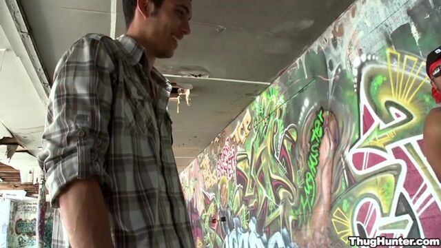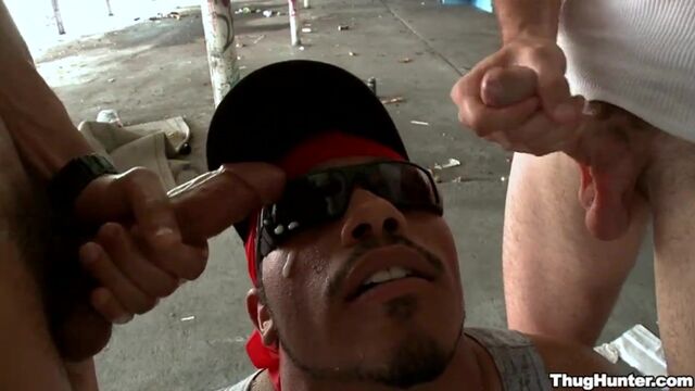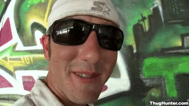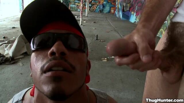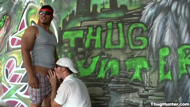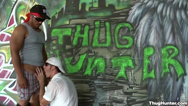 - Description: Today the hunter decides to take me to the HOOD!!!!!! THE REAL HOOD!!!! NOT THE RAP HOOD!!!!!!!!! Anyway, I'm not a bitch or anything like that but fuck that, I wanted to get the fuck out of there as fast as possible.. The hunter brought his long time hunting partner with him for some serious action today.. So we end up in this little graphitti spot, where we drew giants cock's and sign them with "Thug Hunter" & shit like that & out of nowhere, this big dude comes rushing us pissed off!!!! We sprayed over his shit!!!! But lucky us, this thug don't mind getting his dick sucked by 2 white dudes : ) YOU KNOW THE TABLES TURNED QUICK ON HIS ASS!!!!!!!! LITERALLY!!