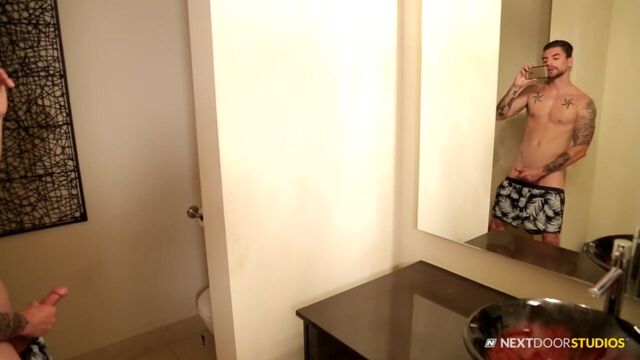 With their fellow roomie busy out by the pool, Brandon Rivers steals away inside to go check on Johnny Torque, who has been gone for quite some time now. Passing by a cracked doorway, Brandon catches Johnny in the middle of a furious self-love session, but makes the mistake of bumping the door and Johnny looks up and sees him, giving chase as Brandon flees. Catching up to him on the sofa, he throws Brandon down and with his dick still out, puts it all up in Brandon's face. To his astonishment, Brandon takes it willingly, opening his mouth and sucking on the tip, then downing it completely as Johnny feeds it to him. Brandon sucks Johnny off quietly so as not to alarm or bring any suspicion. Johnny trades off with Brandon and gives him head, licking his balls as he jerks Brandon off, and Brandon gets all the way turned on, asking Johnny if he's ever had his ass eaten. Johnny shakes his head but bends over anyway as Brandon eats him out, tonguing Johnny deep as he realizes how much it turns him on. Ready to fuck, Johnny bends him over and pounds Brandon's sweet ass from behind. Brandon takes it like a champ but tells Johnny he wants to be in control, so he mounts Johnny and proceeds to ride him good and proper. Johnny watches Brandon's bubble butt bounce on his cock, giving it a nice smack as he watches his cock disappear inside Brandon. As they fuck, they hear the back door open and sprint to the bathroom. Fairly positive that they haven't been caught, Brandon tells Johnny to fuck the cum out of him so Johnny pins him up against the sink and pounds him hard as Brandon strokes himself to orgasm. Covered in his own cum, Brandon tells Johnny to feed him his load, so he gets down on his knees as Johnny quenches his lustful thirst. Exhaling, they hear the door creak and catch their other roommate spying through the door. Seems what goes around cums around after all. Enjoy!