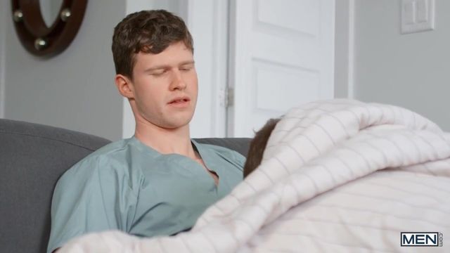 Tanner Hall brings home his boyfriend, Ryan Jacobs, for a visit to his sick dad, but the horny couple are more interested in getting to know hot healthcare worker Finn Harding. Finn flirts with Tanner but snubs Ryan, then takes a break to sneakily stroke his cock on the couch. Tanner catches him and gets under a blanket to suck him, encouraging Ryan to crawl over and take a turn blowing the sexy uncut top. When Finn catches them, they hatch a new plan to have Ryan hide under a blanket and get rawed! Finn eventually catches on when the cute bottom can't stay quiet, and Tanner gets to fuck Ryan's mouth while he watches Finn fuck his hole. Next, Tanner gets fucked doggystyle by Finn and sucks Ryan, and both bottoms take turns riding the hunky caregiver until Tanner cums on Finn's hard abs. Ryan blows a load on Tanner's ass and rubs it in, and then the couple kneel to take a hot facial together.