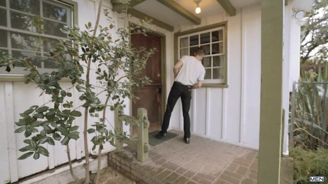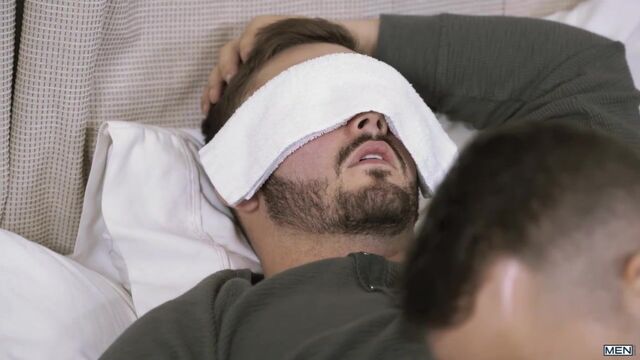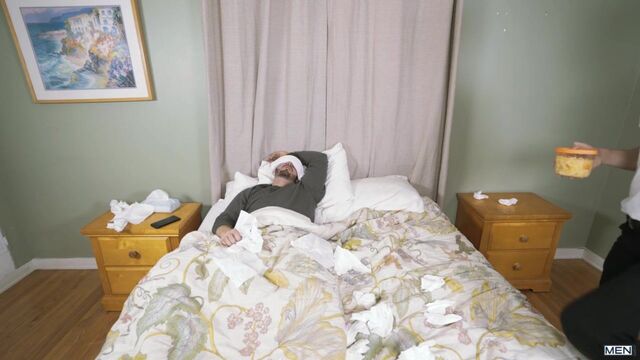 Trevor Long is sick and recovering in bed when Nate Grimes arrives with some soup. Nate can’t help but pull Trevor’s cock out while he’s in bed; with his eyes covered by a cloth, Trevor thinks his girlfriend has arrived in a kinky mood. His hard dick in a warm mouth feels so good, he keeps Nate around after the initial shock to finish the job he started.