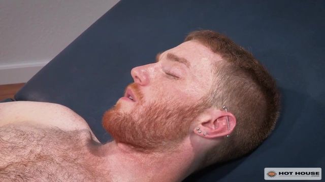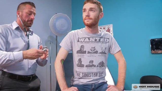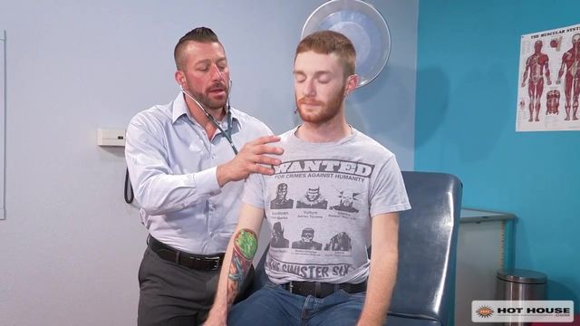 Slim and slender, ginger hunk Seamus O' Reilly comes to visit his muscled doctor, Hugh Hunter, for a routine physical. Things quickly escalate when Seamus is instructed strip down to his boxers exposing his raging hard-on. Dr. Hugh takes notice at Seamus' hefty bulge, and removes Seamus' underwear. Needing to fully examine every inch of Seamus' cock and hole intimately, Dr. Hugh strips down and fingers and licks Seamus' ass as he strokes his own hard, thick meat. This is a full on tongue exploration of Seamus' ass. After Dr. Hugh is satisfied with his patient's sexual health, he tests Seamus' anal capacity by gliding his cock into Seamus' obviously eager ass. After getting pounded on his back, Seamus bends over and spreads his ass-cheeks apart, giving Dr. Hugh the opportunity to drill him deeper and deeper. Cum flies through the air as Hugh shoots his load onto Seamus' back.